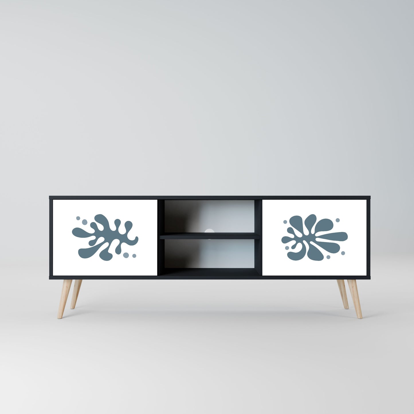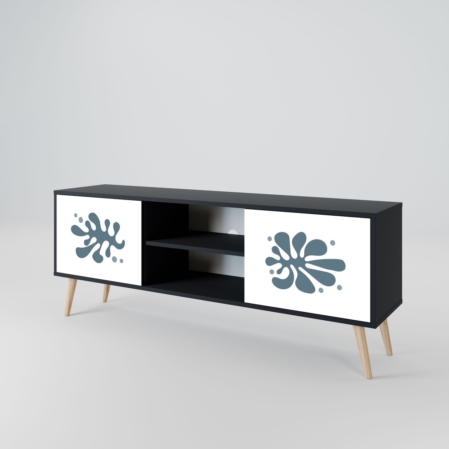 Il corpo nero conferisce al mobile TV un aspetto elegante e moderno, mentre i frontali con una stampa eccezionale attirano l'attenzione, rendendolo il punto focale di ogni stanza. L'interno spazioso offre spazio per dispositivi elettronici, cavi, telecomandi e altri accessori, aiutandoti a mantenere ordine e organizzazione.